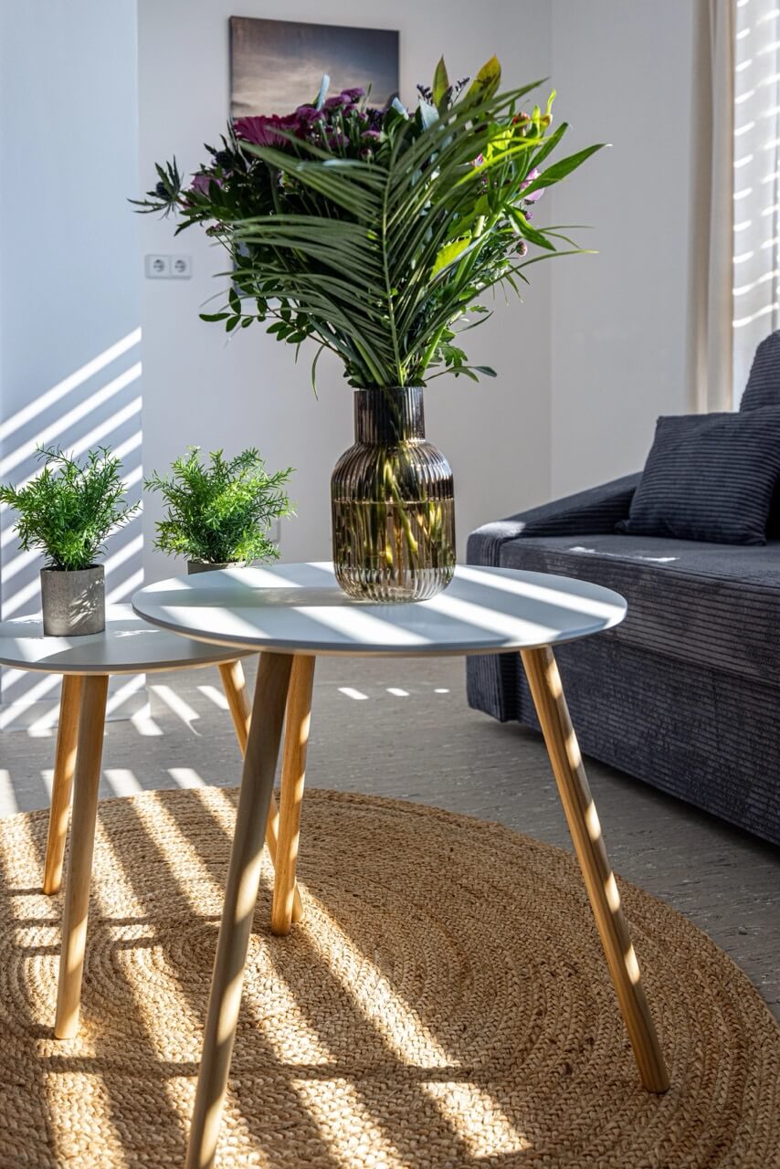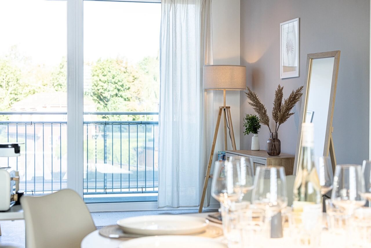Unsere stilvolle Ferienwohnung Scandi Style Large vereint modernes Design mit der Gemütlichkeit des skandinavischen Hygge-Stils. Der helle Eingangsbereich mit warmen Holzelementen vermittelt sofort ein Gefühl von Zuhause. Der großzügige Essbereich bietet Platz für bis zu 6 Personen und eignet sich perfekt für gemeinsame Mahlzeiten.