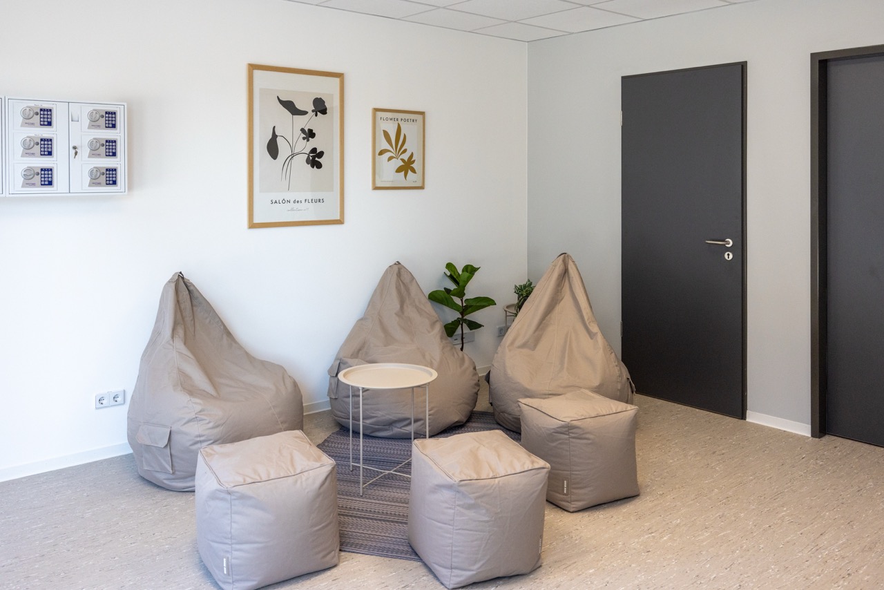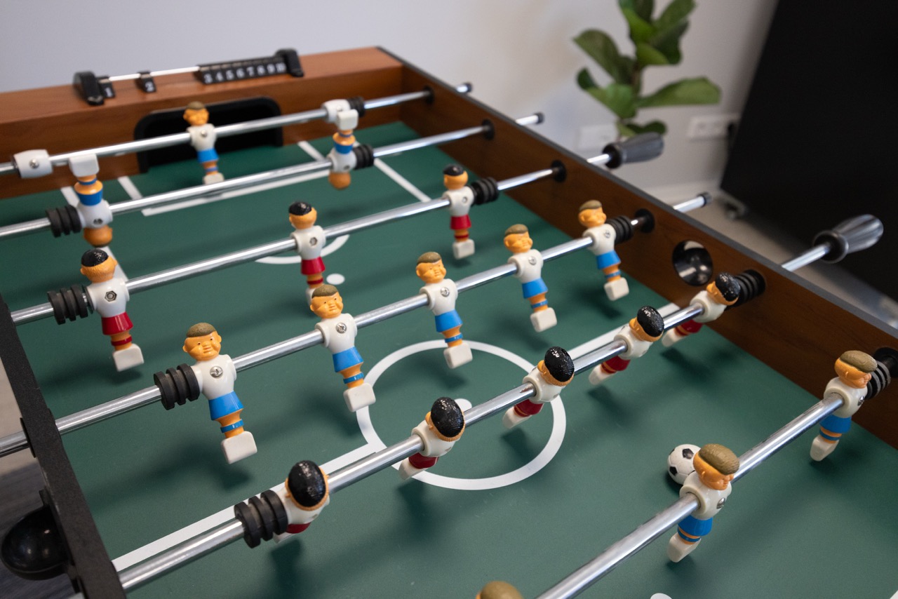 Im Lounge-Bereich warten ein Getränkeautomat und ein Tischkicker – perfekt für eine kleine Pause oder ein Match zwischendurch. Zusätzlich befindet sich auch hier der Waschraum mit Waschmaschine und Trockner, welcher allen Gästen zur Verfügung steht. So siehst du auf einen Blick, dass bei HYGGE HOMES auch der Außen- und Gemeinschaftsbereich für einen entspannten Aufenthalt sorgt.
