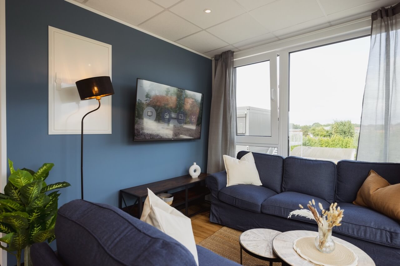 Das Skandi Sunset verbindet modernes Design mit der Gemütlichkeit des Hygge-Stils. Vier Schlafzimmer mit insgesamt sieben Schlafplätzen sind stilvoll eingerichtet und bieten Stauraum, Fernseher und viel Tageslicht.
